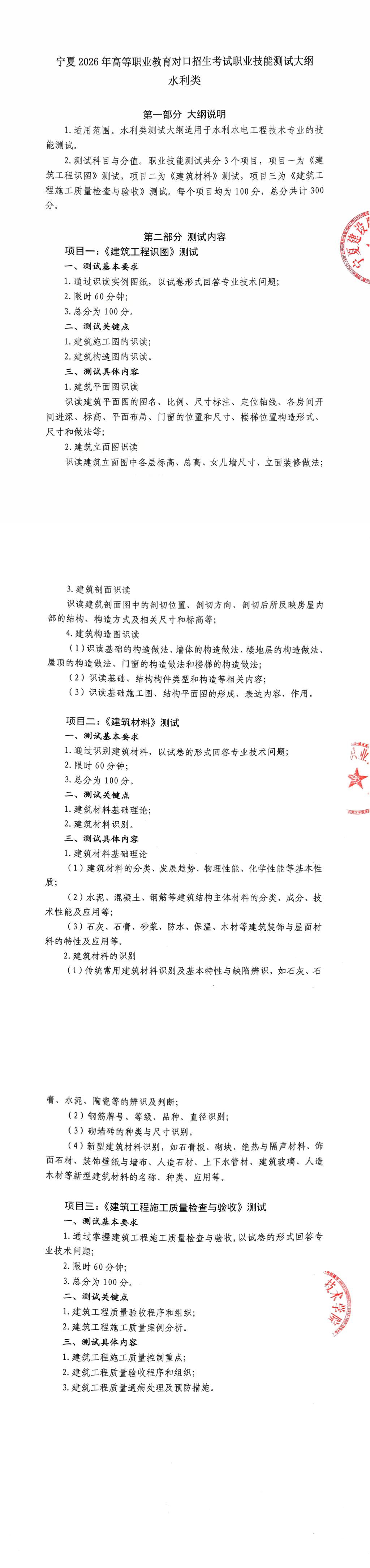宁夏2026年高等职业教育对口招生职业技能测试大纲(水利类)