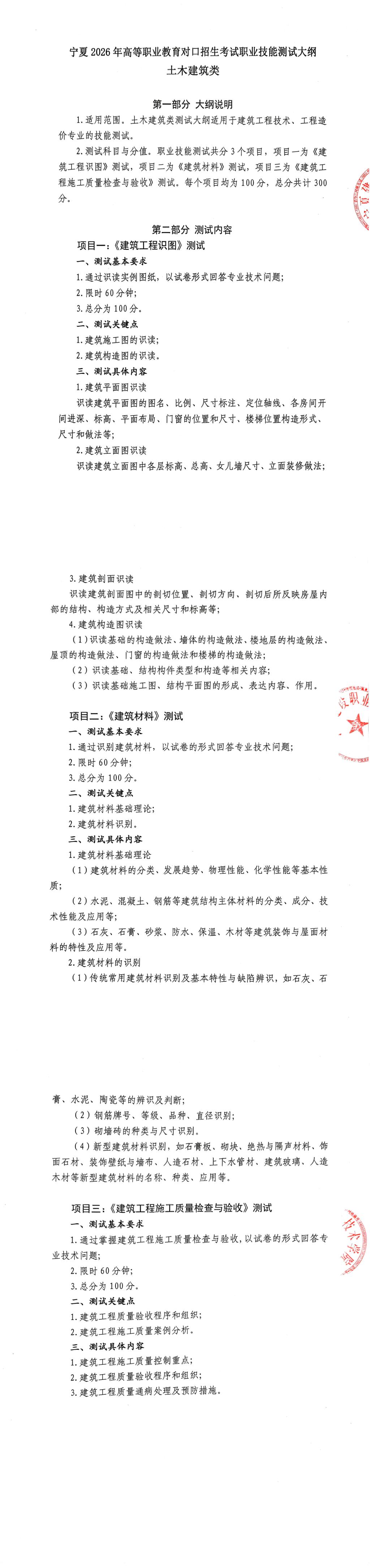 宁夏2026年高等职业教育对口招生职业技能测试大纲(土木建筑类)