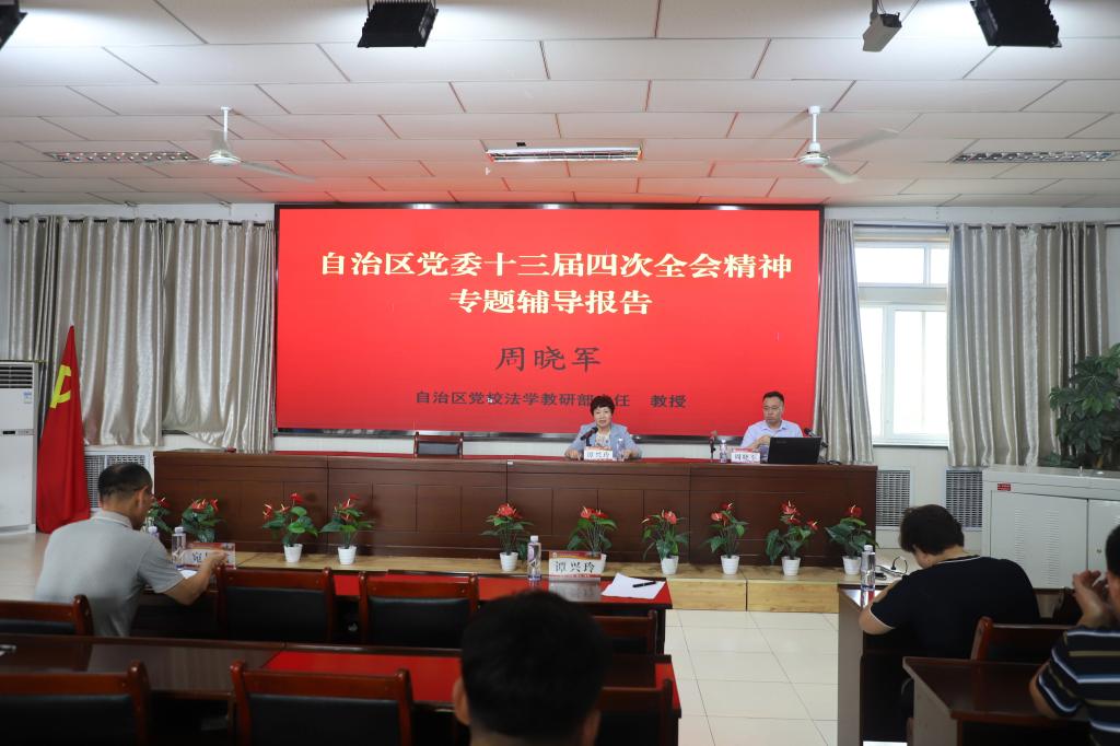 为认真学习贯彻自治区党委十三届四次全会精神,深入开展好主题教育,8月3日上午,学院举办学习贯彻自治区党委十三届四次全会精神专题辅导报告会,邀请自治区党校法学教研部主任周晓军作专题辅导。报告会由学院党委书记谭兴玲主持。