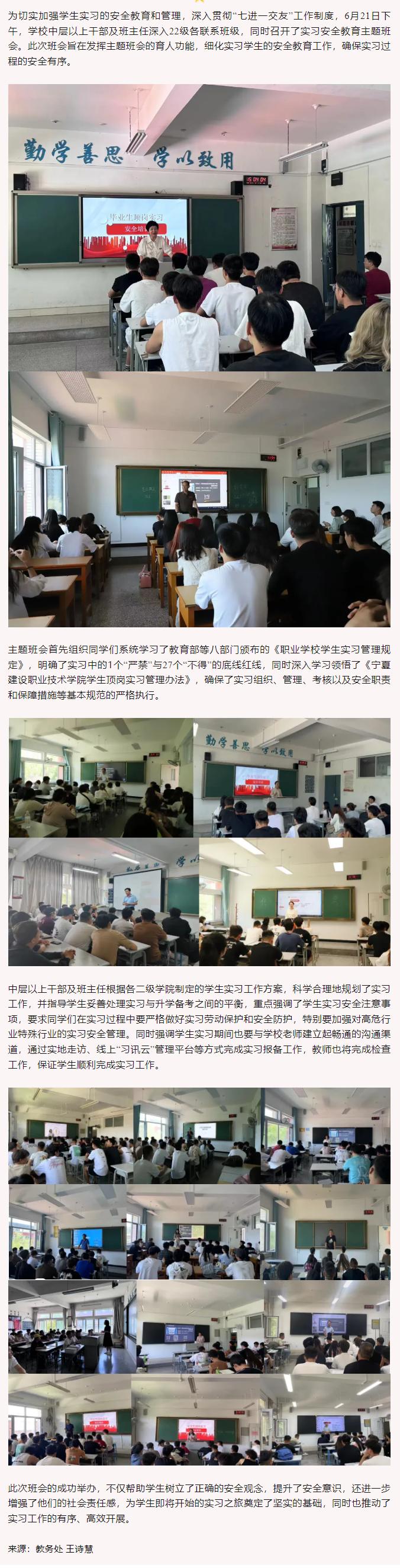 学校党委书记谭兴玲、校长宛国成带领中层以上干部及班主任深入联系班级召开实习安全教育主题班会
